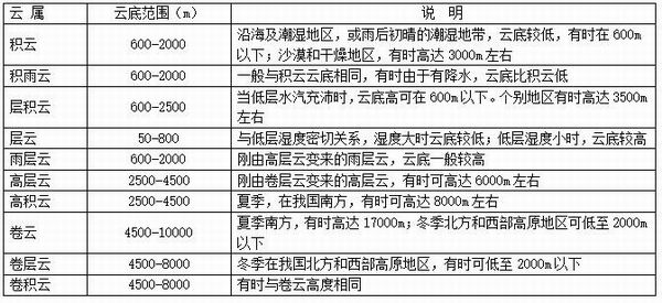 下表是我国各属云常见云底高度。由于我国幅员辽阔,地形复杂,各地云底高度相差很大,所以表中数据仅供估计云高时参考。