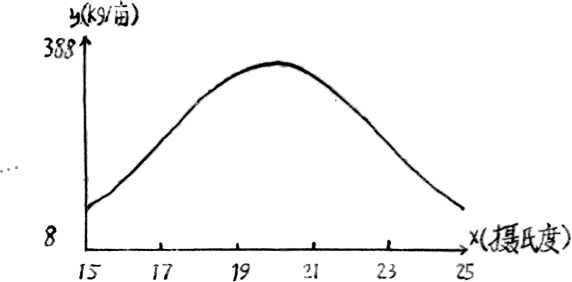 该式是一个有最大值的正态回归模型,当X=14.06℃ ,Y取得最大值251.0千克/亩。产量曲线图略。