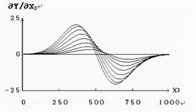 通过(2)式计算,可用图-2来描述年降水量对春小麦产量贡献率∂Y/∂X3与年降水量间的关系。图中,纵坐标∂Y/∂x3为年降水量对春小麦产量的贡献率(kg/hm2 /mm),横坐标X3为当地年降水量(mm)。其中,变幅最大的一条曲线是当土壤有机质含量X1为5.0%,年平均气温X2为2.0℃时,年降水量对春小麦产量贡献率曲线;变幅次之的一条曲线是当土壤有机质含量X1仍为5.0%,但年平均气温X2为3.0℃时,年降水量对春小麦产量贡献率曲线;以下类推。