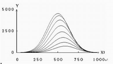 通过(1)式计算,可用图-1来描述春小麦产量与全年降水量间的关系。图中,纵坐标Y为单位面积产量(kg/hm2 ),横坐标X3为当地年降水量(mm)。其中,有8条正态曲线,自上而下分别是年平均气温X 2为2.0、3.0、…9.0℃,土壤有机质含量X1均为5.0%时,春小麦产量Y 与年降水量X 3的关系曲线。