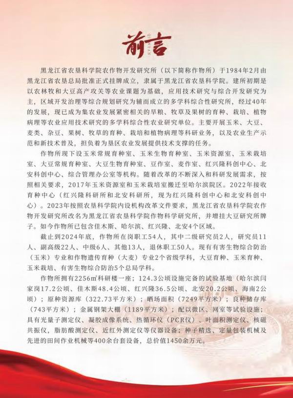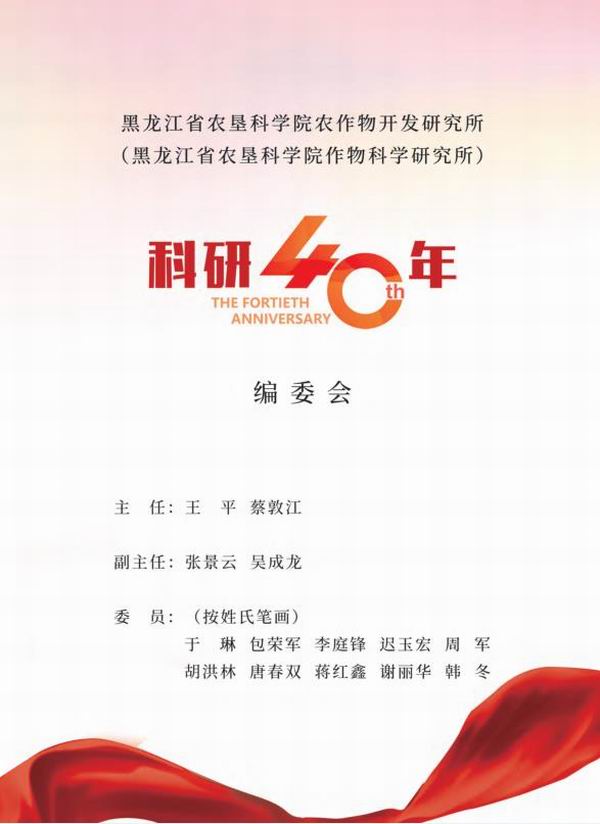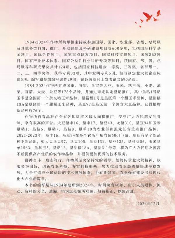 黑龙江省农垦科学院农作物开发研究所2024年12月正式出版了《科研四十年》一书,全书178页,约18万字。书中全面、系统地介绍了该研究所自1984年成立以来所取得的成就。