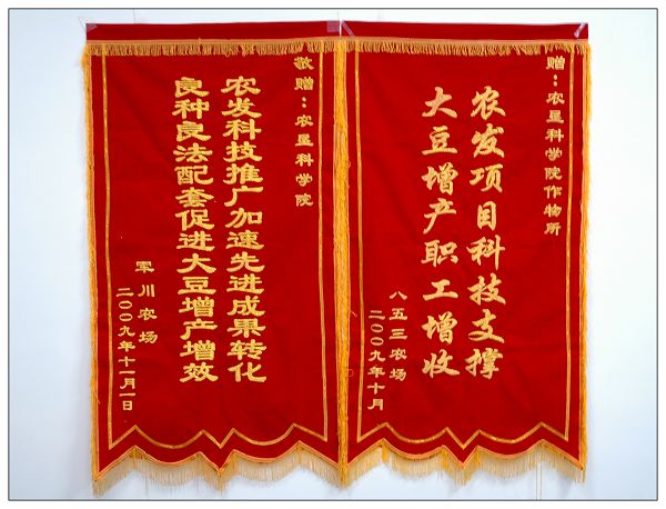 2009年11月27日,农垦总局农业开发项目的两个示范农场军川农场和八五三农场的农业科领导来到农垦科学院作物所,送来锦旗,以感谢农垦科学院和作物所在农发项目上所作出的贡献和不遗余力的技术支持。