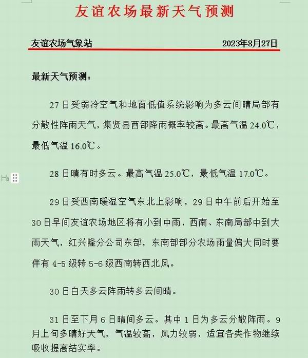 编者按:友谊农场气象站在农业生产的关键季节,每隔几天就发布一次农用天气预报,很受欢迎。