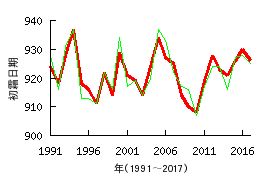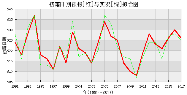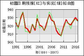 图-5 初霜日期预报与实况拟合图(彩色、有背景)