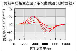 在预报方法中,选择“常用绘图工具”;计算项目中,选择“双叶模型”;结果显示中,选择“预报图”;点击“计算按钮”,就会输出显示“贡献率随生态因子变化曲线图”(见图-8)。此图可用于大数据分析,用于农业气象数据分析,用于农作物配方施肥等。图-9和图-10,是这张图的另外五种变化形式。