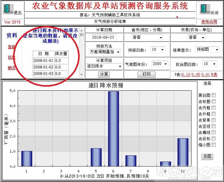 进入“气象信息与预报工具平台”系统后,“预报方法”选方差周期叠加,“计算项目”选逐日降水,点击“计算”按钮。这时在数据区应当显示你站的逐日降水数据。见图-1。