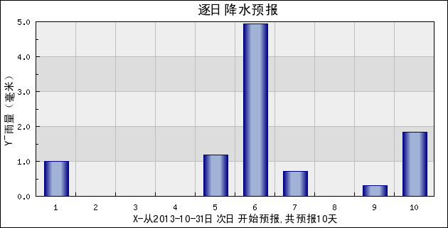 “预报方法”选方差周期叠加,“计算项目”选逐日降水,“预报天数”选10天,“结果显示”选预报,点击“计算”按钮,进行计算。片刻后,就会显示预报结果图(见图-1)。图中预报该旬(10天)有三次降水过程:11月1日前后1.0mm左右、5-7日7.0mm左右、10日前后2.0mm左右。