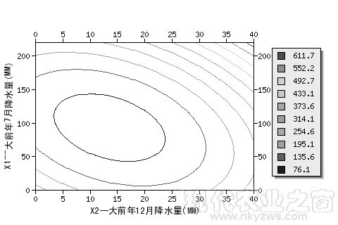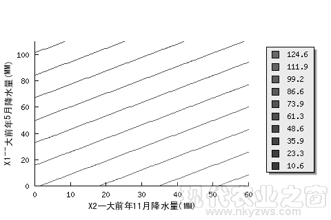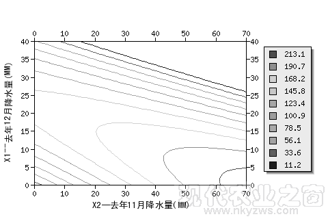 图18是黑龙江垦区某地用去年12月降水量(X1)和去年11月降水量(X2)预报当年7月降水量的二元二次回归预报图,纵坐标为X1,横坐标为X2。图中的曲线为当年7月降水量预报等值线(其中,最内圈等值线的值为213.1MM,次圈为190.7MM,最外圈为11.2MM,共10圈,详见图中标注)。从图中可以看出,当去年12月降水量X1少(比如,少于5MM),且去年11月降水量X2多时(比如,大于62MM),可预报当年7月降水量为多(213MM以上)。统计数据表明,这个预报方法,回归标准误差为30.2MM。