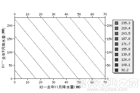 图20是黑龙江垦区某地用去年9月降水量(X1)和去年11月降水量(X2)预报当年7月降水量的二元线性回归预报图,纵坐标为X1,横坐标为X2。图中10条直线为当年7月降水量等值线(其中,左下角的直线的值为92.2MM,挨着它的一条直线为108.1MM,右上角的一条直线为235.3MM,详见图中标注)。统计数据表明,这个预报方法,回归标准误差为37.5MM。